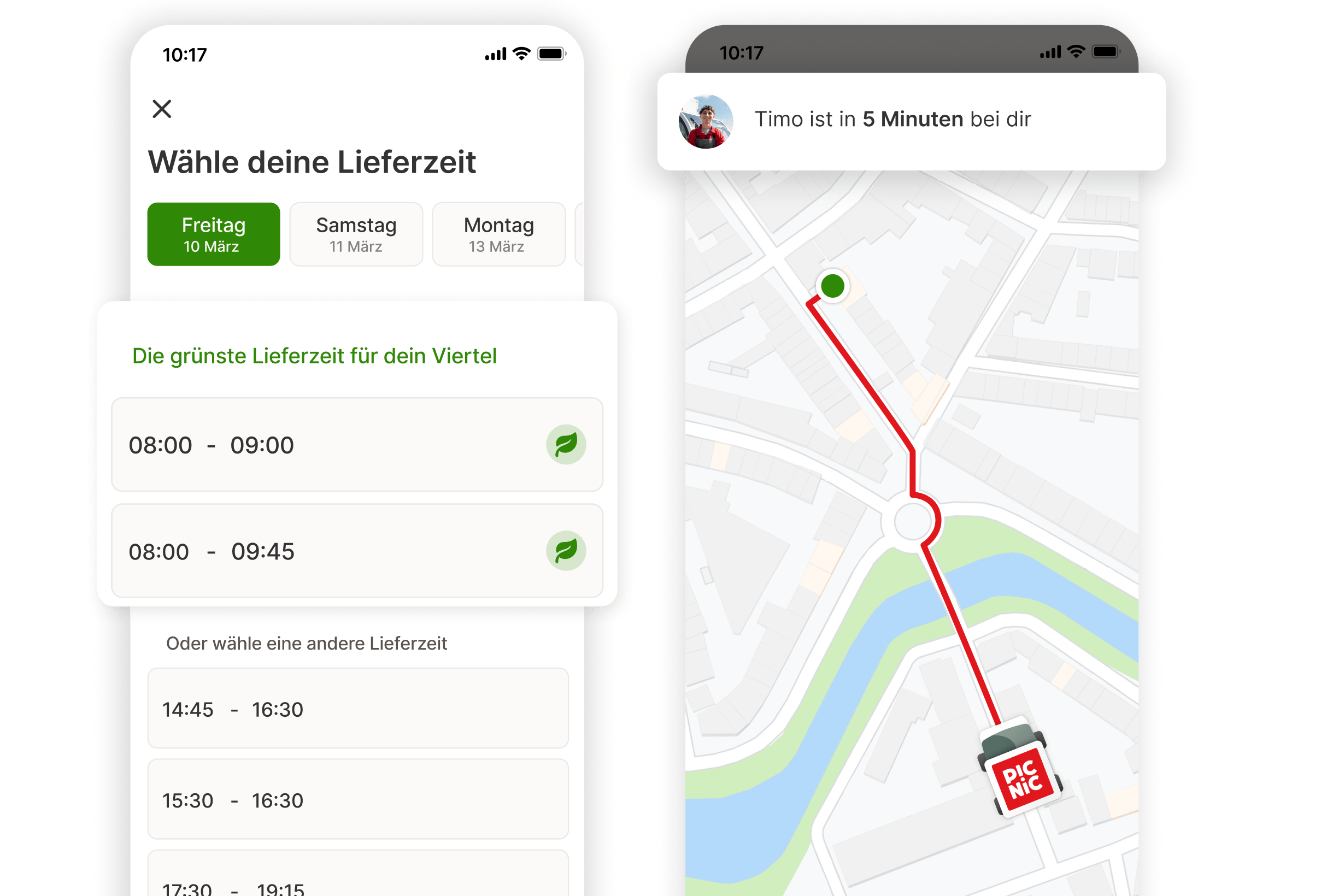 Du fragst dich, bis wann du bei Picnic bestellen kannst? Deine Bestellung kannst du bis zum Vortag der Lieferung abschließen. Natürlich kannst du auch Lieferzeiten wählen, die weiter in der Zukunft liegen, zum Beispiel in der nächsten Woche. Am Tag der Lieferung geben wir dir ein genaues 20-Minuten-Fenster, in dem wir zu dir kommen. Dabei kannst du in der App live verfolgen, in welcher Straße wir gerade sind.