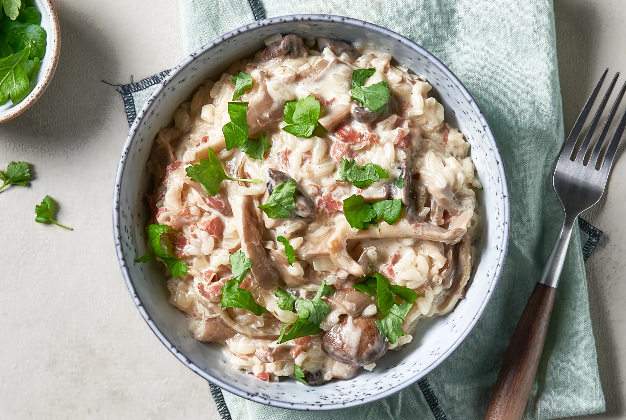 Risotto crémeux avec pancetta, champignons et parmesan. Encore plus savoureux avec des asperges vertes ou une salade fraîche.